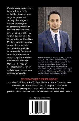 Noodzakelijke gesprekken bevat vijftien spraakmakende interviews over de grote vragen van deze tijd. Daarin gaat Mounir Samuel geen ongemakkelijk thema of maatschappelijke uitdaging uit de weg. Of het nu leven in quarantaine, de klimaatcrisis, de Black Lives Matter-beweging, gender, de zorg, het onderwijs, God en religie, politieke representatie, feminisme, intimiteit, depressie, het ouderschap of de verwerking van verlies betreft. Met een scherpe pen destilleert Samuel samen met zijn gesprekspartners een nieuwe wereld.