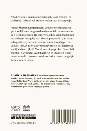 Nooit genoeg is een intieme zoektocht naar grenzen, zowel fysiek, relationeel, emotioneel als maatschappelijk. Auteur Sharvin Ramjan neemt de lezer mee tijdens een persoonlijke reis langs steden die cruciale momenten in zijn leven markeren. Hij onderzoekt hoe vriendschappen veranderen, vraagt hij zich af waar persoonlijke en maatschappelijke grenzen in zijn werkende leven liggen en verkent hij wat alternatieve relatievormen ons leren over nabijheid en vrijheid. Vanuit een uitgesproken Queer blik toont hij hoe macht, kwetsbaarheid en identiteit elkaar voortdurend kruisen en hoe die onze keuzes en mogelijkheden mee bepalen.