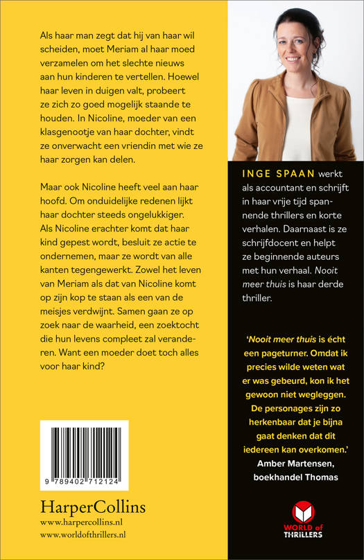 ‘Nooit meer thuis is écht een pageturner. Omdat ik precies wilde weten wat er is gebeurd, kon ik het gewoon niet wegleggen. De personages zijn zo herkenbaar dat je bijna gaat denken dat dit iedereen kan overkomen.’ Amber Martensen, boekhandel Thomas in Bergen