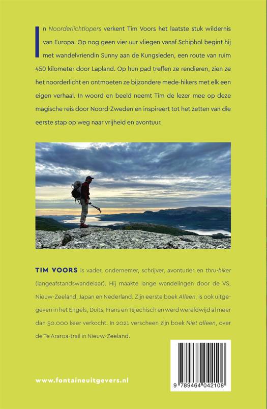 Fanatieke wandelaars, beginnende lopers en leunstoelreizigers: wie de boeken van Tim Voors leest, heeft het gevoel met hem mee te lopen. Dwars door de ongerepte natuur, door weer en wind, volgt de lezer zijn wandeltochten op de voet. Noorderlichtlopers is Tims derde boek.