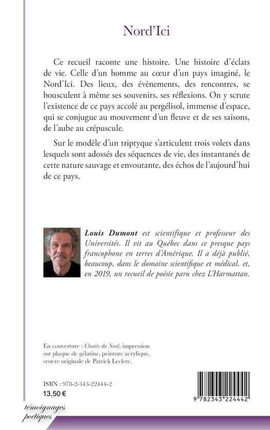 Ce recueil raconte une histoire. Une histoire d’éclats de vie. Celle d’un homme au coeur d’un pays imaginé, le Nord’Ici. Des lieux, des évènements, des rencontres, se bousculent à même ses souvenirs, ses réflexions. On y scrute l’existence de ce pays accolé au pergélisol, immense d’espace, qui se conjugue au mouvement d’un fleuve et de ses saisons, de l’aube au crépuscule.