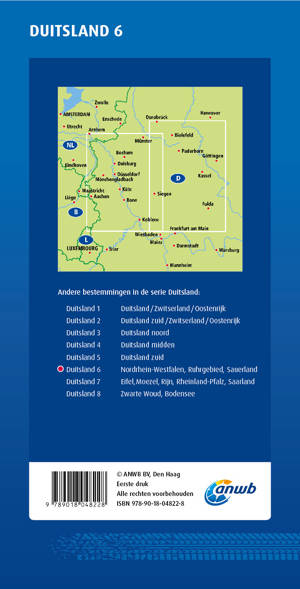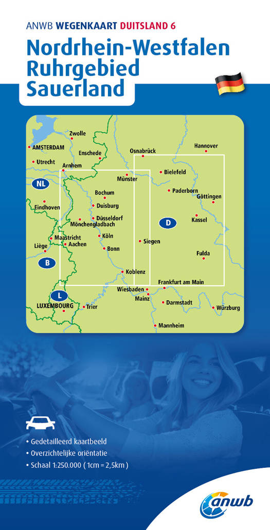 Met de gedetailleerde en nauwkeurige ANWB Wegenkaart Duitsland 6. Nordrhein-Westfalen, Ruhrgebied, Sauerland ga je goed voorbereid op autovakantie. Schaal van 1:250.000 (1 cm = 2,5 km).