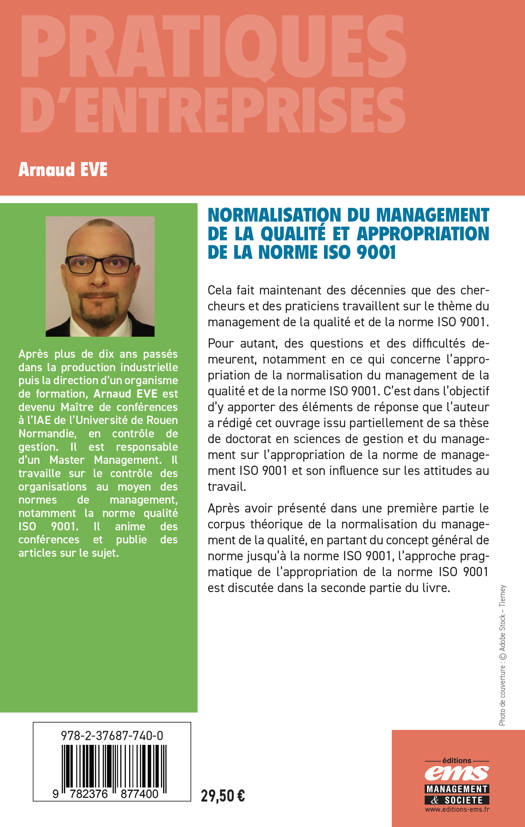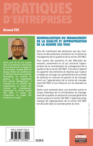 Pour autant, des questions et des difficultés demeurent, notamment en ce qui concerne l’appropriation de la normalisation du management de la qualité et de la norme ISO 9001. C’est dans l’objectif d’y apporter des éléments de réponse que l’auteur a rédigé cet ouvrage issu partiellement de sa thèse de doctorat en sciences de gestion et du management sur l’appropriation de la norme de management ISO 9001 et son influence sur les attitudes au travail.