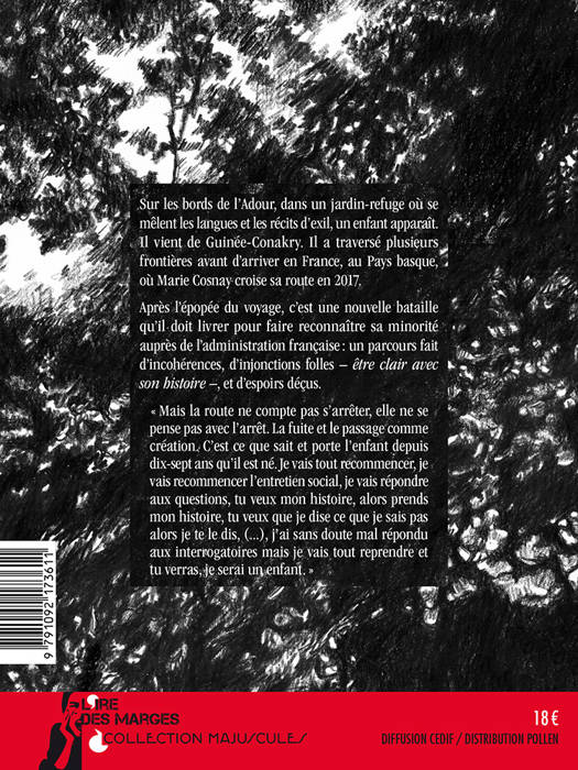 En 2017, Marie Cosnay est en résidence dans un jardin merveilleux sur les bords de l’Adour. Chaque mercredi, elle y retrouve des réfugiés en attente d’un toit ou d’un droit. Ensemble ils collectent, traduisent des mots et partagent les récits de l’exil. <br /><br /> C’est alors qu’un enfant se présente et avec lui la question de la protection de l’enfance. <br /><br /> Saâ vient de Guinée-Conakry. Il a travaillé dur pour payer le passeur, traversé plusieurs frontières et subi mille violences avant d’arriver en France, à Irun, où Marie Cosnay croise sa route.<br /><br /> Il a seize ans et après l’épopée du voyage, c’est une nouvelle bataille qu’il doit livrer pour faire reconnaître sa minorité auprès de l’administration française et bénéficier d’une protection : un parcours faits d’incohérences, d’injonctions folles – être clair avec son histoire⯖, et d’espoirs déçus. <br /><br /> Du conte au documentaire, Marie Cosnay fait surgir les images, nomme l’insupportable et porte les voix de ceux dont on refuse de considérer les vies.