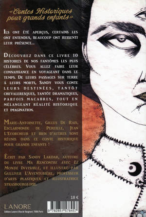 Ils ont été aperçus, certains les ont entendus, beaucoup ont ressenti leur présence... Découvrez dans ce livre 10 histoires de nos fantômes les plus célèbres. Vous allez faire leur connaissance en voyageant dans le temps. De leurs passages sur terre à leurs morts, Sandy vous conte leurs destinées, tantôt chevaleresques, tantôt dramatiques, parfois macabres, tout en mélangeant réalité historique et imagination. Marie-Antoinette, Gilles De Rais, Esclarmonde de Pereille, Jean L'Ecorcheur et bien d'autres sont réunis dans ce conte historique pour grands enfants !
