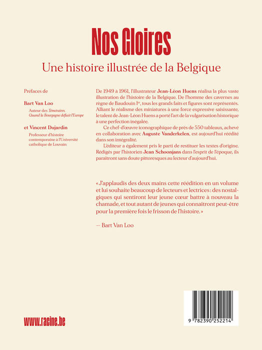 De 1949 à 1961, l'illustrateur Jean-Léon Huens réalisa la plus vaste illustration de l'histoire de la Belgique. De l'homme des cavernes au règne de Baudouin Ier, tous les grands faits et figures sont représentés. Alliant le réalisme des miniatures à une force expressive saisissante, le talent de Jean-Léon Huens a porté l'art de la vulgarisation historique à une perfection inégalée.