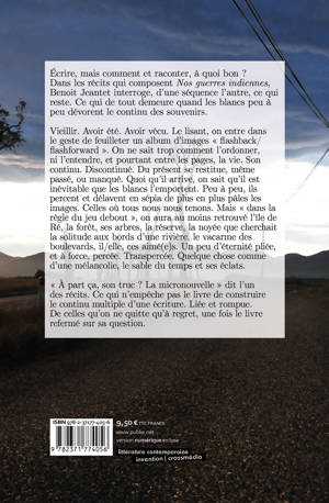 Écrire, mais comment et raconter, à quoi bon ? Dans les récits qui composent Nos guerres indiennes, Benoit Jeantet interroge, d’une séquence l’autre, ce qui reste. Ce qui de tout demeure quand les blancs peu à peu dévorent le continu des souvenirs. Vieillir. Avoir été. Avoir vécu. Le lisant, on entre dans le geste de feuilleter un album d’images « flashback / flashforward ». On ne sait trop comment l’ordonner, ni l’entendre, et pourtant entre les pages, la vie. Son continu. Discontinué. Du présent se restitue, même passé, ou manqué. Quoi qu’il arrive, on sait qu’il est inévitable que les blancs l’emportent. Peu à peu, ils percent et délavent en sépia de plus en plus pâles les images. Celles où tous nous nous tenons. Mais « dans la règle du jeu debout », on aura au moins retrouvé l’île de Ré, la forêt, ses arbres, la réserve, la noyée que cherchait la solitude aux bords d’une rivière, le vacarme des boulevards, il/elle, ces aimé(e)s. Un peu d’éternité pliée, et à force, percée. Transpercée. Quelque chose comme d’une mélancolie, le sable du temps et ses éclats. « À part ça, son truc ? La micronouvelle » dit l’un des récits. Ce qui n’empêche pas le livre de construire le continu multiple d’une écriture. Liée et rompue. De celles qu’on ne quitte qu’à regret, une fois le livre refermé sur sa question.