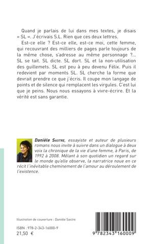 SL est peu à peu devenu Félix. Puis il redevient par moments SL. SL cherche la forme que devrait prendre ce que j'écris. Il coupe mon langage de points et de silence qui remplacent les virgules. C'est lui que je peins. Nous nous essayons à vivre-écrire. Et la vérité est sans garantie.