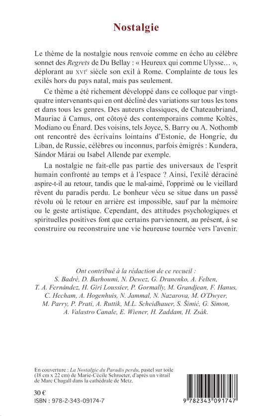 La nostalgie fait-elle partie des universaux de l'esprit humain ? Ce thème a été développé par vingt-quatre intervenants qui en ont décliné des variations sur tous les tons, dans tous les genres. Des classiques de Chateaubriand, Mauriac à Camus, ont côtoyé des contemporains comme Koltès, Modiano ou Enard, des voisins tels que Joyce, Barry ou Nothomb ont rencontré des écrivains lointains d'Estonie, de Hongrie, du Liban, de Russie, célèbres ou inconnus, parfois émigrés : Kundera, Sandor Marai ou Isabel Allende.