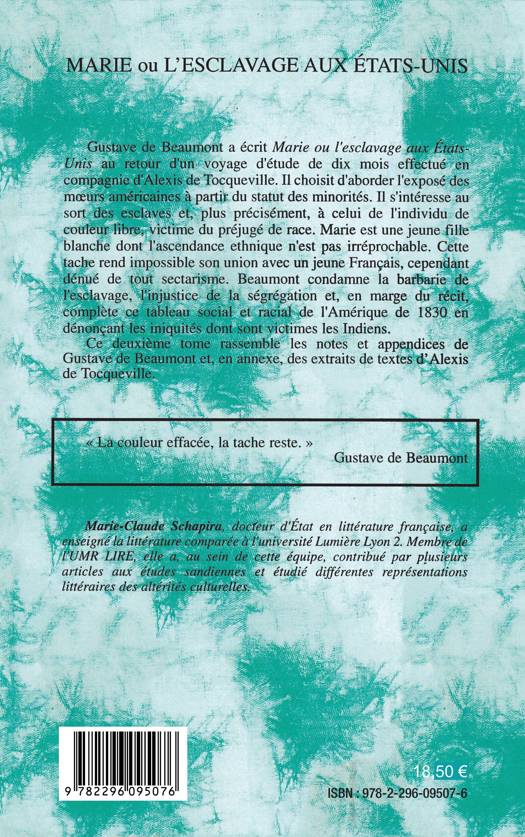 Gustave de Beaumont a écrit Marie ou l'esclavage aux Etats-Unis au retour d'un voyage d'étude de dix mois effectué en compagnie d'Alexis de Tocqueville. Il choisit d'aborder l'exposé des moeurs américaines à partir du statut des minorités. Il s'intéresse au sort des esclaves et, plus précisément, à celui de l'individu de couleur libre. Ce deuxième tome rassemble les notes et appendices de Gustave de Beaumont et, en annexe, des extraits de textes d'Alexis de Tocqueville.