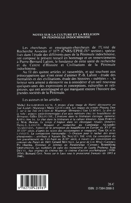 Un recueil réalisé par les chercheurs de l'unité de recherche associée n° 1075 spécialisée dans l'étude des différents pays de la péninsule indochinoise. 15 articles à propos des expressions et conceptions culturelles et religieuses ayant accompagné et marquant encore l'histoire des grandes sociétés de la péninsule.