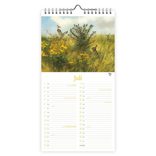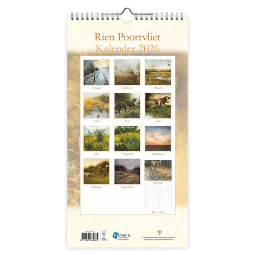 Prachtige maandnotitiekalender met natuurtekeningen van Rien Poortvliet. Iedere maand is een feest om naar te kijken! Deze kalender (18 x 34,5 cm) is bovendien voorzien van alle feest-en vakantiedagen van Nederland en België en makkelijk op te hangen. Rien Poortvliet zag zichzelf als een tekenend verhaalverteller. Zijn tekeningen vertellen zelf voor het grootste deel het verhaal al, hooguit met een kleine titel of opschrift. Zijn volledige portfolio kan op zijn minst indrukwekkend genoemd worden: van boerderij leven en jagerij tot werken van de kabouter. Hij vatte alles samen in realistische tekeningen die direct zijn liefde voor de natuur lieten zien. Ook leuk als cadeau!