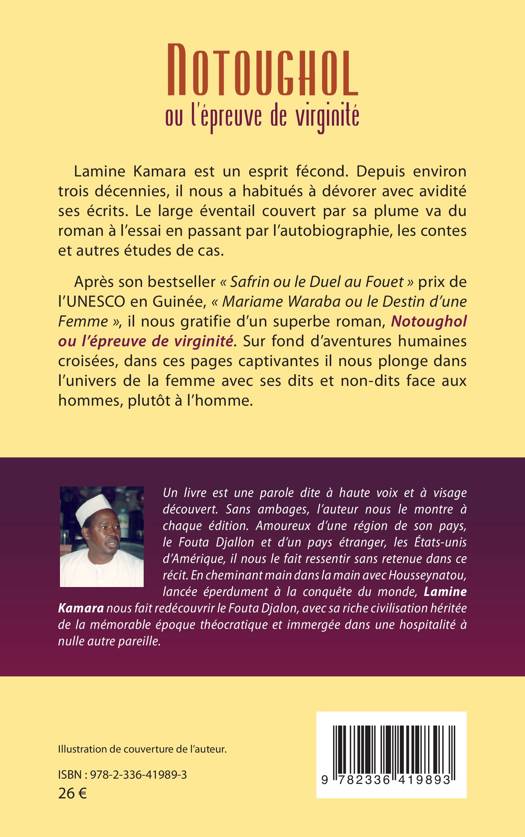 Lamine Kamara est un esprit fécond. Depuis environ trois décennies, il nous a habitués à dévorer avec avidité ses écrits. Le large éventail couvert par sa plume va du roman à l'essai en passant par l'autobiographie, les contes et autres études de cas. Après son bestseller « Safrin ou le Duel au Fouet » prix de l'UNESCO en Guinée, « Mariame Waraba ou le Destin d'une Femme », il nous gratifie d'un superbe roman, Notoughol ou l'Épreuve de virginité. Sur fond d'aventures humaines croisées, dans ces pages captivantes il nous plonge dans l'univers de la femme avec ses dits et non-dits face aux hommes, plutôt à l'homme.
