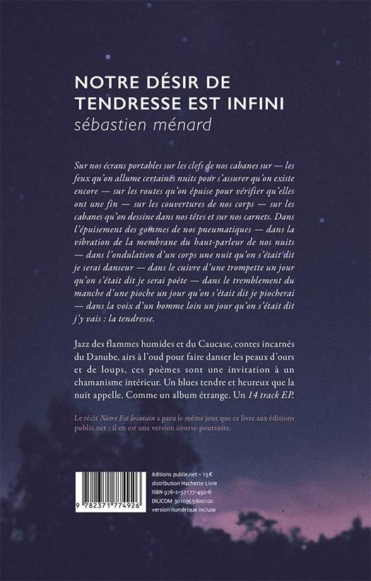 Comme un album folk étrange, Notre désir de tendresse est infini s'écoute autant qu'il se lit. Conçu pour la déclamation à voix haute et porté par une création musicale, ce 14 tracks EP est un voyage autour du monde tel qu'il s'écoule en et en dehors de nous. Et si en réalité sa forme sauvage était celle d'un disque fou, où les mots dits se tissent à mesure que l'instrument avance avec eux ? Un lieu étrange aux racines multiples, dans la proximité des voix de Daniel Biga, Fred Griot ou Allen Ginsberg, entre performance beat, conte de l’Est et bœuf entre musiciens de la langue.