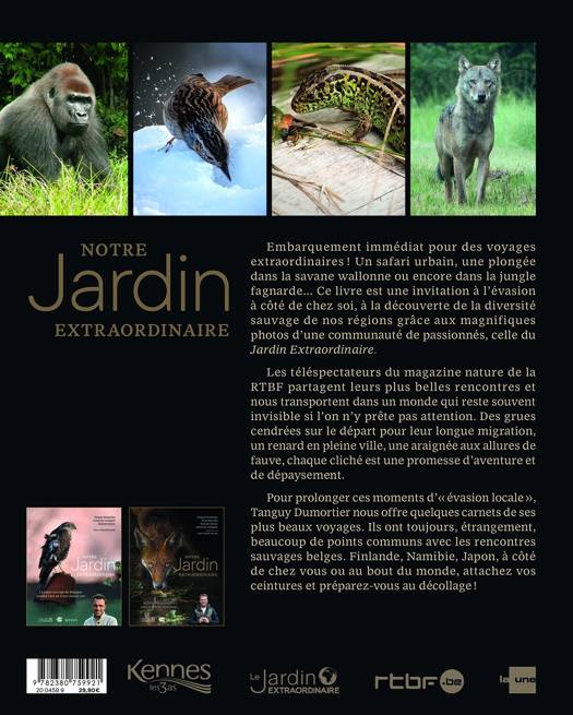 Embarquement immédiat pour des voyages extraordinaires ! Un safari urbain, une plongée dans la savane wallonne ou encore dans la jungle fagnarde... Ce livre est une invitation à l’évasion à côté de chez soi, à la découverte de la diversité sauvage de nos régions grâce aux magnifiques photos d’une communauté de passionnés, celles du “Jardin Extraordinaire”. Les téléspectateurs du magazine nature de la RTBF partagent leurs plus belles rencontres et nous transportent dans un monde qui reste souvent invisible si on n’y prête pas attention. Des grues cendrées sur le départ de leur longue migration, un renard en pleine ville, une araignée aux allures de fauve, chaque cliché est une promesse d’aventure et de dépaysement. Pour prolonger ces moments “d’évasion locale”, Tanguy Dumortier nous offre quelques carnets de ses plus beaux voyages. Ils ont toujours, étrangement, beaucoup de points communs avec les rencontres sauvages belges. Spitzberg, Australie, Madagascar, à côté de chez vous ou au bout du monde, attachez vos ceintures et préparez- vous au décollage !