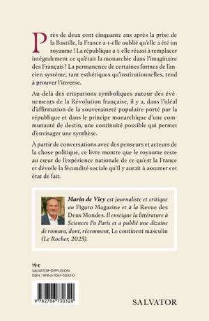 Près de deux cent cinquante ans après la prise de la Bastille, la France a-t-elle oublié qu'elle a été un royaume ? La république a-t-elle réussi à remplacer intégralement ce qu'était la monarchie dans l'imaginaire des Français ? La permanence de certaines formes de l'ancien système, tant esthétiques qu'institutionnelles, tend à prouver l'inverse. Au-delà des crispations symboliques autour des événements de la Révolution française, il y a, dans l'idéal d'affirmation de la souveraineté populaire porté par la république et dans le principe monarchique d'une communauté de destin, une continuité possible qui permet d'envisager une synthèse. À partir de conversations avec des penseurs et acteurs de la chose politique, ce livre montre que le royaume reste au cÅur de l'expérience nationale de ce qu'est la France et dévoile la fécondité sociale qu'il y aurait à assumer cet état de fait.