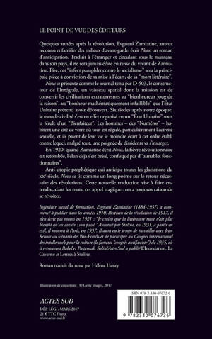 Quelques années après la révolution, Evgueni Zamiatine, auteur reconnu et familier des milieux d'avant-garde, écrit Nous, un roman d'anticipation. Traduit à l'étranger et circulant sous le manteau dans son pays, il ne sera jamais édité en russe du vivant de Zamiatine. Pire, cet "infect pamphlet contre le socialisme" sera la principale pièce à conviction de sa mise à l'écart, de sa "mort littéraire". Nous se présente comme le journal tenu par D-503, le constructeur de l'Intégrale, un vaisseau spatial dont la mission est de convertir les civilisations extraterrestres au "bienheureux joug de la raison", au "bonheur mathématiquement infaillible" que l'État Unitaire prétend avoir découvert. Six siècles après notre époque, le monde civilisé s'est en effet organisé en un "État Unitaire" sous la férule d'un "Bienfaiteur". Les hommes - des "Numéros" - habitent une cité de verre où tout est régulé, particulièrement l'activité sexuelle, et ils paient de leur vie le moindre écart à cet ordre établi contre lequel, malgré tout, une poignée de dissidents va s'insurger. En 1920, quand Zamiatine écrit Nous, la fièvre révolutionnaire est retombée, l'élan déjà s'est brisé, confisqué par d'"aimables fonctionnaires". Anti-utopie prophétique qui anticipe toutes les glaciations du xxe siècle, Nous se lit comme un long poème sur le retour nécessaire des révolutions. Cette nouvelle traduction vise à faire entendre, dans les mots, cet appel tragique : on a toujours raison de se révolter.