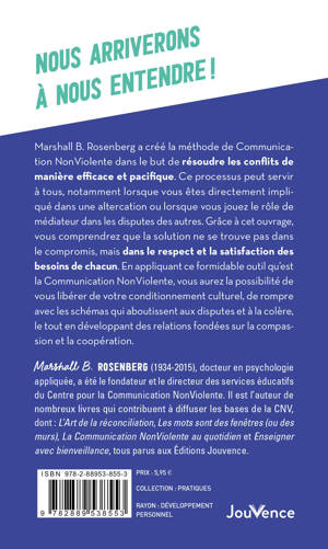 Marshall B. Rosenberg a créé la méthode de Communication NonViolente dans le but de résoudre les conflits de manière efficace et pacifique. Ce processus peut servir à tous, notamment lorsque vous êtes directement impliqué dans une altercation ou lorsque vous jouez le rôle de médiateur dans les disputes des autres. Grâce à cet ouvrage, vous comprendrez que la solution ne se trouve pas dans le compromis, mais dans le respect et la satisfaction des besoins de chacun. En appliquant ce formidable outil qu’est la Communication NonViolente, vous aurez la possibilité de vous libérer de votre conditionnement culturel, de rompre avec les schémas qui aboutissent aux disputes et à la colère, le tout en développant des relations fondées sur la compassion et la coopération.