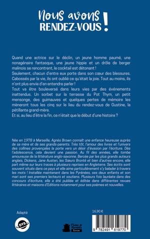 Quand une actrice sur le déclin, un jeune homme paumé, une nonagénaire fantasque, une jeune hippie et un drôle de berger malinois se rencontrent, le cocktail est détonant ! Seulement, chacun d'entre eux porte dans son coeur des blessures. Cabossés par la vie, ils ont oublié ce qu'était la joie. Tout au moins, ils n'ont plus envie d'en entendre parler ! Tout va être bouleversé dans leurs vies par des événements inattendus. Un sorbet sur la terrasse du Pot Thym, un petit mensonge, des guimauves et quelques pertes de mémoire les mèneront tous les cinq sur le lieu du rendez-vous de Gustine, la pétillante grand-mère. Et si, au lieu d'être la fin, ce n'était que le début d'une histoire ?