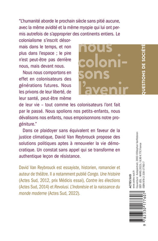 "L'humanité aborde le prochain siècle sans pitié aucune, avec la même avidité et la même myopie qui lui ont permis autrefois de s'approprier des continents entiers. Le colonialisme s'inscrit désormais dans le temps, et non plus dans l'espace ; le pire n'est peut-être pas derrière nous, mais devant nous. Nous nous comportons en effet en colonisateurs des générations futures. Nous les privons de leur liberté, de leur santé, peut-être même de leur vie - tout comme les colonisateurs l'ont fait par le passé. Nous spolions nos petits-enfants, nous dévalisons nos enfants, nous empoisonnons notre progéniture." Dans ce plaidoyer sans équivalent en faveur de la justice climatique, David Van Reybrouck propose des solutions politiques aptes à renouveler la vie démocratique. Un constat sans appel qui se transforme en authentique leçon de résistance.