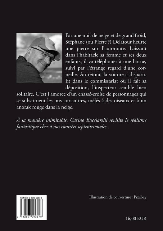 Par une nuit de neige et de grand froid, Stéphane (ou Pierre ?) Delatour heurte une pierre sur l’autoroute. Laissant dans l’habitacle sa femme et ses deux enfants, il va téléphoner à une borne, suivi par l’étrange regard d’une corneille. Au retour, la voiture a disparu. Et dans le commissariat où il fait sa déposition, l’inspecteur semble bien solitaire. C’est l’amorce d’un chassé-croisé de personnages qui se substituent les uns aux autres, mêlés à des oiseaux et à un anorak rouge dans la neige.<br /> À sa manière inimitable, Carino Bucciarelli revisite le réalisme fantastique cher à nos contrées septentrionales.<br />