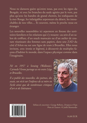 Nous ne dansons guère qu’entre nous, pas avec les tigres du Bengale, ni avec les branches du saule agitées par le vent, pas plus qu’avec les bandits de grand chemin, les trafiquants de la mer Rouge, les infatigables arpenteurs du désert, les intouchables de nos villes... Et souvent, même le proche nous est étranger. Les nouvelles rassemblées ici arpentent en finesse des territoires familiers et les relations qui s’y nouentâ: au sein d’un salon de coiffure, d’un snack marocain ou d’un atelier de couture réunissant des femmes sans papiers, dans une ZAD du côté d’Arlon ou sur une ligne de tram à Bruxelles. Elles nous invitent, avec ironie et légèreté, à découvrir de multiples façons d’habiter le monde, dans l’espace physique comme dans l’imaginaire. Né en 1957 à Seraing (Wallonie), Carmelo Virone partage sa vie entre Liège et Bruxelles. Il a publié des nouvelles, des poèmes, des essais, un récit sur l’enfance de sa mère en Sicile ainsi que de nombreuses critiques d’art et de littérature. Il a longtemps dirigé la principale revue de critique littéraire centrée sur la littérature de Belgique francophone.