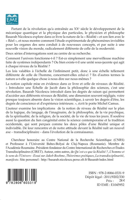 Partant de la révolution qu’a entraînée au XXe siècle le développement de la mécanique quantique et la physique des particules, le physicien et philosophe Basarab Nicolescu explore dans ce livre la nature de la « Réalité » et son lien avec le « Réel », et nous montre comment l'étude expérimentale de phénomènes invisibles pour les organes des sens conduit à de nouveaux concepts, et par suite à une nouvelle vision du monde, radicalement différente de celle de la modernité...