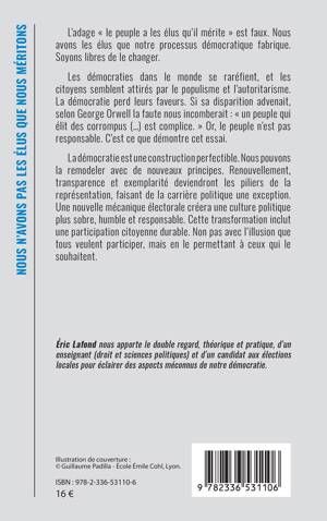L'adage le peuple a les élus qu'il mérite est faux. Nous avons les élus que notre processus démocratique fabrique. Soyons libres de le changer. Les démocraties dans le monde se raréfient, et les citoyens semblent attirés par le populisme et l'autoritarisme. La démocratie perd leurs faveurs. Si sa disparition advenait, selon George Orwell la faute nous incomberait: un peuple qui élit des corrompus (...) est complice. Or, le peuple n'est pas responsable. C'est ce que démontre cet essai. La démocratie est une construction perfectible. Nous pouvons la remodeler avec de nouveaux principes. Renouvellement, transparence et exemplarité deviendront les piliers de la représentation, faisant de la carrière politique une exception. Une nouvelle mécanique électorale créera une culture politique plus sobre, humble et responsable. Cette transformation inclut une participation citoyenne durable. Non pas avec l'illusion que tous veulent participer, mais en le permettant à ceux qui le souhaitent.