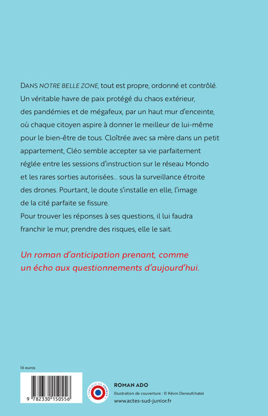 DANS NOTRE BELLE ZONE, tout est propre, ordonné et contrôlé. Un véritable havre de paix protégé du chaos extérieur, des pandémies et de mégafeux, par un haut mur d'enceinte, où chaque citoyen aspire à donner le meilleur de lui-même pour le bien-être de tous. Cloîtrée avec sa mère dans un petit appartement, Cléo semble accepter sa vie parfaitement réglée entre les sessions d'instruction sur le réseau Mondo et les rares sorties autorisées... sous la surveillance étroite des drones. Pourtant, le doute s'installe en elle, l'image de la cité parfaite se fissure. Pour trouver les réponses à ses questions, il lui faudra franchir le mur, prendre des risques, elle le sait.
