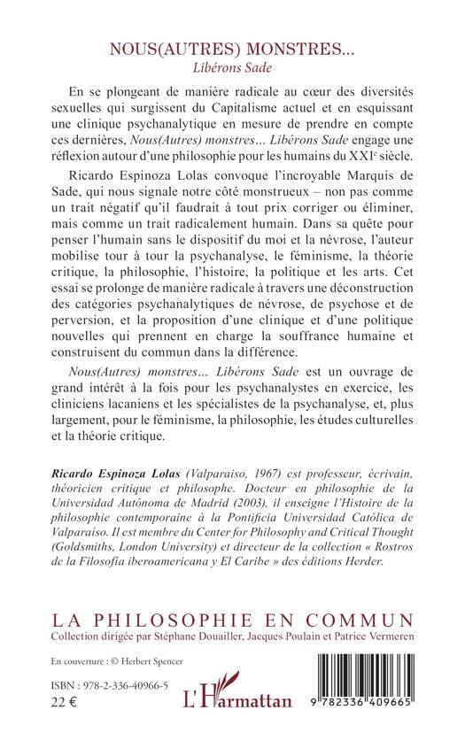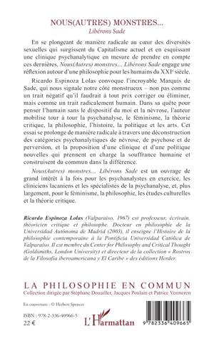 En se plongeant de manière radicale au cœur des diversités sexuelles qui surgissent du Capitalisme actuel et en esquissant une clinique psychanalytique en mesure de prendre en compte ces dernières, Nous(Autres) monstres… Libérons Sade engage une réflexion autour d’une philosophie pour les humains du XXIe siècle. Ricardo Espinoza Lolas convoque l’incroyable Marquis de Sade, qui nous signale notre côté monstrueux – non pas comme un trait négatif qu’il faudrait à tout prix corriger ou éliminer, mais comme un trait radicalement humain. Dans sa quête pour penser l’humain sans le dispositif du moi et la névrose, l’auteur mobilise tour à tour la psychanalyse, le féminisme, la théorie critique, la philosophie, l’histoire, la politique et les arts. Cet essai se prolonge de manière radicale à travers une déconstruction des catégories psychanalytiques de névrose, de psychose et de perversion, et la proposition d’une clinique et d’une politique nouvelles qui prennent en charge la souffrance humaine et construisent du commun dans la différence. Nous(Autres) monstres… Libérons Sade est un ouvrage de grand intérêt à la fois pour les psychanalystes en exercice, les cliniciens lacaniens et les spécialistes de la psychanalyse, et, plus largement, pour le féminisme, la philosophie, les études culturelles et la théorie critique.