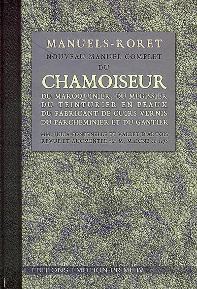 Cet ouvrage est la réédition intégrale du ‘‘Manuels-Roret’’ refondue, corrigée et augmentée par M. Maigne sous le titre : Nouveau manuel complet du chamoiseur du maroquinier, du mégissier, du teinturier en peaux, du fabricant de cuirs vernis, du parcheminier et du gantier. Contenant : La description des outils, des appareils et des procédés les plus récents en usage dans ces diverses industries par MM. Julia-Fontenelle et Vallet d’Artois. L’édition ici reproduite est celle de 1876, illustré de 56 figures dans le texte.