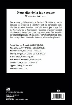 Les nouvelles, en peu de mots, nous font saisir les émotions, les pensées et les préoccupations des auteurs. Les nouvelles de la lune rousse sont un florilège d’émotions : rencontre avec un Mazzeru de Corse, intuitions archéologiques, approche de voyages initiatiques, vie rêvée dans la peau d’un morse, rencontres sensitives, recherche de paradis...Toutes des nouvelles d’une grande étrangeté qui nous plongent dans des univers insolites.