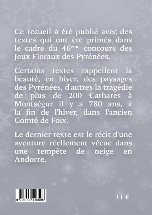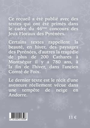 Ce recueil a été publié avec des textes qui ont été primés dans le cadre du 46ème concours des Jeux Floraux des Pyrénées. Certains textes rappellent la beauté, en hiver, des paysages des Pyrénées, d'autres la tragédie de plus de 200 Cathares à Montségur il y a 780 ans, à la fin de l'hiver, dans l'ancien Comté de Foix. Le dernier texte est le récit d'une aventure réellement vécue dans une tempête de neige en Andorre.