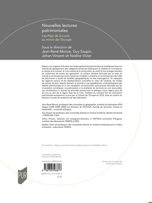 Depuis une vingtaine d’années, les modes opératoires patrimoniaux se caractérisent par une volonté de dépassement des catégories anciennes distinguant le matériel et l’immatériel, le naturel et le culturel, le monumental et le vernaculaire, au profit d’une synergie résultant du croisement de toutes ces approches. La critique salutaire formulée par le reste du monde à une Europe qui avait imposé ses modèles, a entraîné un enrichissement de l’idée de patrimoine à toutes les échelles géographiques, et des interrogations. En replaçant les rapports sociaux et les représentations culturelles au coeur de l’analyse, les modes de lecture les plus récents donnent la priorité à une appréhension anthropologique des réalités patrimoniales et à une nécessaire co-construction permanente favorisée par les innovations numériques. La participation à la révélation du territoire en sort renouvelée. Les contributions ici réunies et articulées poursuivent le dialogue nourri depuis plus de dix ans au sein de la région Pays de la Loire. Profitant du moment fort de valorisation patrimoniale européenne voulue par le Conseil de l’Europe en 2018, elles se veulent en réaction à toutes les tentations de repli identitaire.
