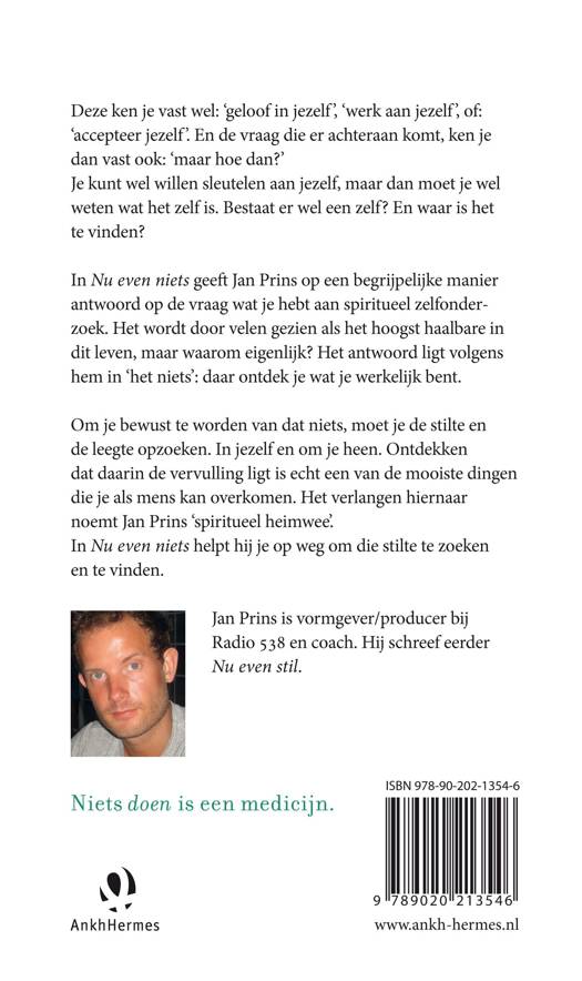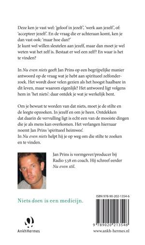 In 'Nu even niets' geeft Jan Prins op een begrijpelijke manier antwoord op de vraag wat je hebt aan bewustwording of spirituele groei. Het wordt door velen gezien als het hoogst haalbare in dit leven, maar waarom eigenlijk? Het antwoord ligt volgens Jan Prins in het niets: daar vind je jezelf terug en ontstaan de mooiste ideeën en dingen. Om je bewust te worden van dat niets, moet je de stilte en de leegte opzoeken. In jezelf en om je heen. Te ontdekken dat daarin de vervulling ligt, is echt een van de mooiste dingen die je als mens kan overkomen. Het verlangen hiernaar noemt Jan Prins spiritueel heimwee. In 'Nu even niets' helpt hij je op weg om die stilte te zoeken en te vinden.