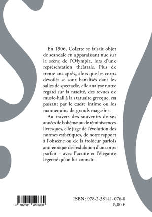 En 1906, Colette se faisait objet de scandale en apparaissant nue sur la scène de l'Olympia, lors d'une représentation théâtrale. Plus de trente ans après, alors que les corps dévoilés se sont banalisés dans les salles de spectacle, elle analyse notre regard sur la nudité, des revues de music-hall à la statuaire grecque, en passant par le cadre intime ou les mannequins de grands magasins.