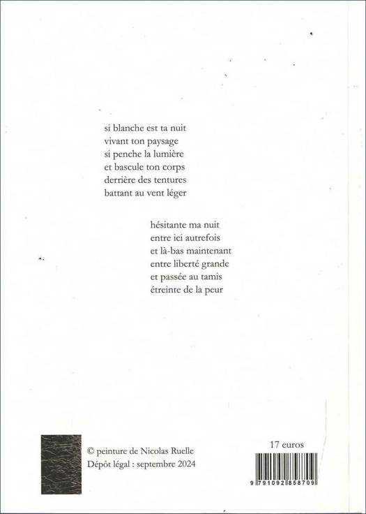 Nuit blanche est d’abord le titre d’un tableau dont un peintre fait cadeau au poète et que celui-ci a lacéré une nuit de désespoir. Les poèmes de Nuit blanche sont nés de ce drame amoureux, de cet acte quasi délictuel que l’auteur porte en lui, sinon comme une plaie qui ne cicatrise pas, du moins comme un profond regret. Au fur et à mesure que l’on avance dans le recueil, on passe de l’aveu au constat d’impuissance, de Nuit blanche à d’autres nuits blanches qui envahissent le poète car il ne sait comment réhabiliter ce qu’il a détruit. Mais le tableau, devenu virtualité, continue d’exister, selon le voeu du poète, dans la dimension du poème.