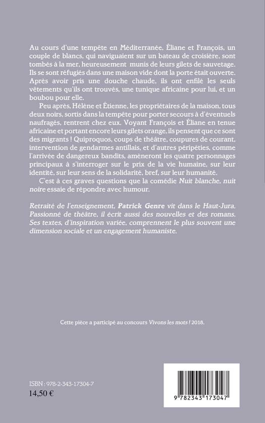 Au cours d'une tempête en Méditerranée, Éliane et François, un couple de blancs, qui naviguaient sur un bateau de croisière, sont tombés à la mer, heureusement munis de leurs gilets de sauvetage. Ils se sont réfugiés dans une maison vide dont la porte était ouverte. Après avoir pris une douche chaude, ils ont enfilé les seuls vêtements qu'ils ont trouvés, une tunique africaine pour lui, et un boubou pour elle. Peu après, Hélène et Étienne, les propriétaires de la maison, tous deux noirs, sortis dans la tempête pour porter secours à d'éventuels naufragés, rentrent chez eux. Voyant François et Éliane en tenue africaine et portant encore leurs gilets orange, ils pensent que ce sont des migrants ! Quiproquos, coups de théâtre, coupures de courant, intervention de gendarmes antillais, et d'autres péripéties, comme l'arrivée de dangereux bandits, amèneront les quatre personnages principaux à s'interroger sur le prix de la vie humaine, sur leur identité, sur leur sens de la solidarité. Bref, sur leur humanité. C'est à ces questions que la comédie Nuit blanche Nuit Noire essaie de répondre avec humour.