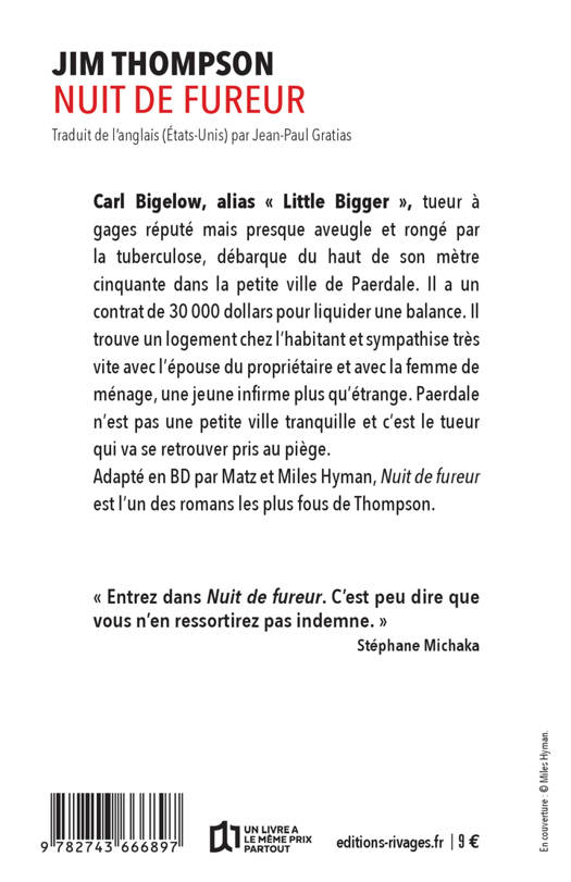 Little Bigger est un tueur à gages tuberculeux qui mesure 1,50m. Et pourtant, on lui propose qui contrat qui lui rapportera 30 000 dollars. Il débarque dans la ville où se trouve sa cible... Une voix narrative inoubliable, un monologue intérieur qui subjugue. Un étonnant roman sur le corps, le rapport à l'infirmité et à la normalité. Un personnage débordant de cette «rage retournée contre une nation qui se prétend égalitaire». Un roman politique comme très souvent chez Thompson, une mise en cause décapante de l'Amérique. Comme pour les trois autres titres réédités, nouvelle couverture de Miles Hyman.