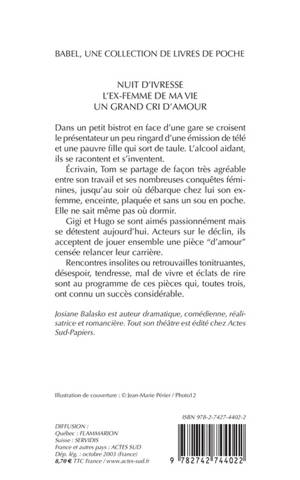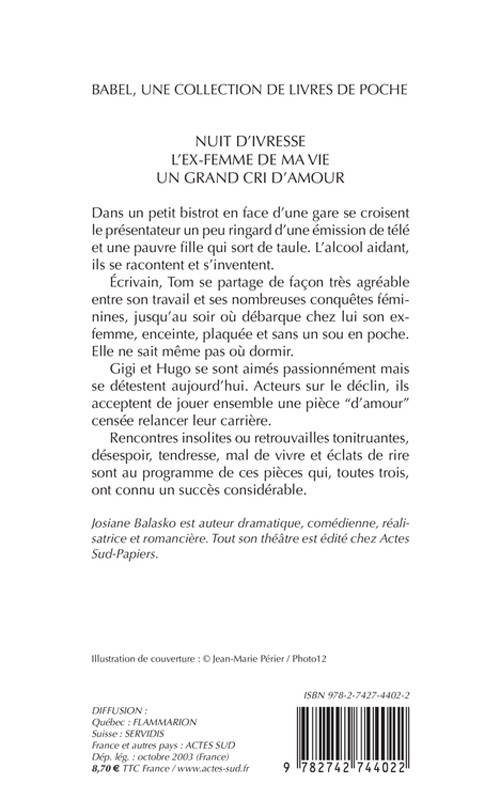 Que ce soit la rencontre alcoolisée entre un présentateur un peu ringard d'une émission de télé et une pauvre fille qui sort de taule, le retour un soir dans la vie de Tom de son ex-femme enceinte, plaquée et sans le sou, ou le baroud d'honneur de Gigi et Hugo qui se sont aimés mais se détestent aujourd'hui, ces trois pièces sont autant de cris de désespoir, de tendresse, et d'éclats de rire.