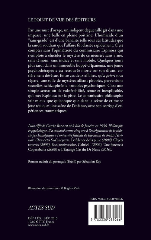 Par une nuit d'orage, un indigent déguenillé gît dans une impasse, une balle en pleine poitrine. L'homicide d'un "sans-grade" est d'une banalité telle sous ces latitudes que la raison voudrait que l'affaire fût classée rapidement. C'est compter sans l'opiniâtreté du commissaire Espinosa qui s'emploie à élucider le mystère de ce meurtre sans arme, sans témoin, sans indice et sans mobile. Quelques jours plus tard, dans un immeuble huppé d'Ipanema, une jeune psychothérapeute est retrouvée morte sur son divan, entièrement dévêtue. Entre ces deux affaires, qu'«a priori» tout sépare, une toile de mystères alliant phobies, perversions sexuelles, schizophrénie, troubles psychotiques. C'est une simple sensation de vulnérabilité, ténue et inexplicable, qui met Espinosa sur la piste. Le commissaire-philosophe sait mieux que quiconque que dans la scène de crime se joue toujours une scène de l'enfance, avec son cortège d'expériences traumatiques.