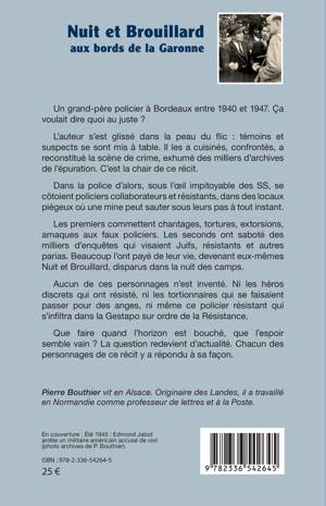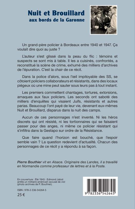 Un grand-père policier à Bordeaux entre 1940 et 1947. Ça voulait dire quoi au juste ? L'auteur s'est glissé dans la peau du flic: témoins et suspects se sont mis à table. Il les a cuisinés, confrontés, a reconstitué la scène de crime, exhumé des milliers d'archives de l'épuration. C'est la chair de ce récit. Dans la police d'alors, sous l'oeil impitoyable des SS, se côtoient policiers collaborateurs et résistants, dans des locaux piégeux où une mine peut sauter sous leurs pas à tout instant. Les premiers commettent chantages, tortures, extorsions, arnaques aux faux policiers. Les seconds ont saboté des milliers d'enquêtes qui visaient Juifs, résistants et autres parias. Beaucoup l'ont payé de leur vie, devenant eux-mêmes Nuit et Brouillard, disparus dans la nuit des camps. Aucun de ces personnages n'est inventé. Ni les héros discrets qui ont résisté, ni les tortionnaires qui se faisaient passer pour des anges, ni même ce policier résistant qui s'infiltra dans la Gestapo sur ordre de la Résistance. Que faire quand l'horizon est bouché, que l'espoir semble vain ? La question redevient d'actualité. Chacun des personnages de ce récit y a répondu à sa façon.