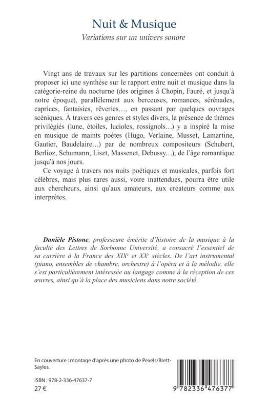 Vingt ans de travaux sur les partitions concernées ont conduit à proposer ici une synthèse sur le rapport entre nuit et musique dans la catégorie-reine du nocturne (des origines à Chopin, Fauré, et jusqu’à notre époque), parallèlement aux berceuses, romances, sérénades, caprices, fantaisies, rêveries…, en passant par quelques ouvrages scéniques. À travers ces genres et styles divers, la présence de thèmes privilégiés (lune, étoiles, lucioles, rossignols…) y a inspiré la mise en musique de maints poètes (Hugo, Verlaine, Musset, Lamartine, Gautier, Baudelaire…) par de nombreux compositeurs (Schubert, Berlioz, Schumann, Liszt, Massenet, Debussy…), de l’âge romantique jusqu’à nos jours.