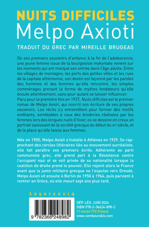 De ses premiers souvenirs d'enfance à la fin de l'adolescence, une jeune femme issue de la bourgeoisie mykoniate revient sur les moments qui ont marqué son entrée dans l'âge adulte. Entre les villages de montagne, les ports des petites villes et les rues de la capitale athénienne, son destin est façonné par les paroles des hommes et des femmes qu'elle rencontre, les simples commérages prenant la forme de mythes fondateurs qu'elle écoute attentivement, sans pour autant se laisser influencer. Paru pour la première fois en 1937, "Nuits difficiles" est le premier roman de Melpo Axioti, qui nourrit son écriture de ses propres souvenirs. Les récits s'y entremêlent pour former des motifs entêtants, semblables à ceux des broderies réalisées par les femmes lors des longues nuits d'hiver, où se dessine en creux un portrait saisissant de la société grecque du début du XXe siècle, et de la place qu'elle laisse aux femmes.