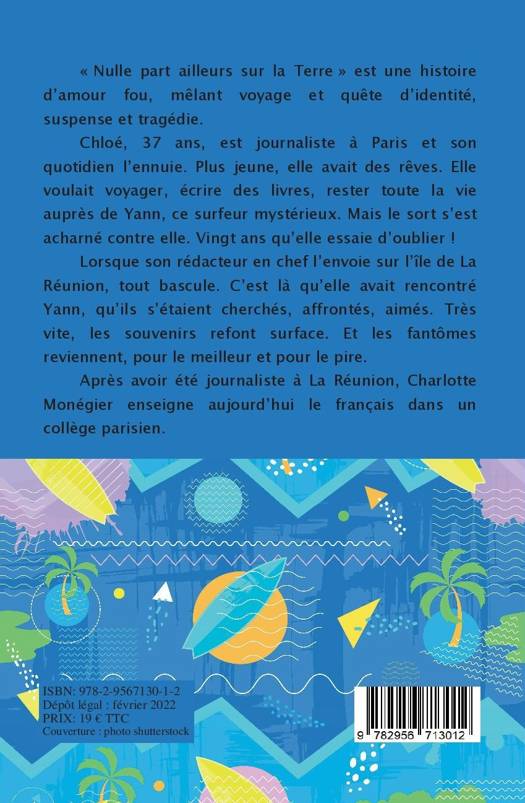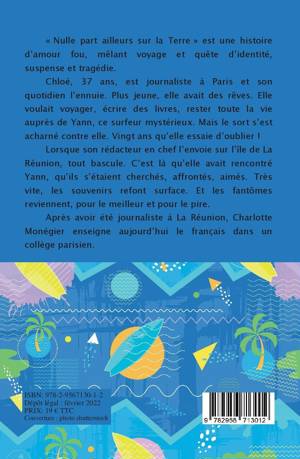 Nulle part ailleurs sur la Terre est une histoire d’amour fou, mêlant voyage et quête d’identité, suspense et tragédie. Chloé, 37 ans, est journaliste à Paris et son quotidien l’ennuie. Plus jeune, elle avait des rêves. Elle voulait voyager, écrire des livres, rester toute la vie auprès de Yann, ce surfeur mystérieux. Mais le sort s’est acharné contre elle. Vingt ans qu’elle essaie d’oublier ! Lorsque son rédacteur en chef l’envoie sur l’île de La Réunion, tout bascule. C’est là qu’elle avait rencontré Yann, qu’ils s’étaient cherchés, affrontés, aimés. Très vite, les souvenirs refont surface. Et les fantômes reviennent, pour le meilleur et pour le pire. Après avoir été journaliste à La Réunion, Charlotte Monégier enseigne aujourd’hui le français dans un collège parisien.