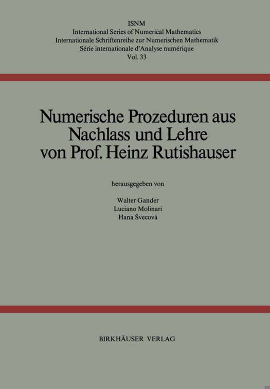 Heinz Rutishauser, der 1970 im Alter von 52 Jahren verstorbene Pionier der modernen numerischen Mathematik, hinterliess ein bedeutendes wis- senschaftliches Erbe. Sein Nachlass umfasst neben seinen Vorlesungen iiber numerische Mathematik auch eine Anzahl fertiger Rechenprozeduren zur Losung verschiedener Standardaufgaben der angewandten Mathematik. Die auf Detailprobleme verwendete Sorgfalt und die Originalitat, mit welcher kritische Situationen narrensicher gemeistert werden, lassen auch diese Prozeduren als typische Produkte des Rutishauserschen Geistes erscheinen. Es ist daher zu begriissen, dass sich W. Gander, L. Molinari und H. Svecova, drei ehemalige Mitarbeiter von Rutishauser, zusammengefunden haben, urn die interessantesten dieser Prozeduren zu erlautern, auszutesten, sorgfaltig zu dokumentieren, in Einzelheiten zu verbessern und zur Publikation vor- zubereiten. Bemerkenswert an diesen Prozeduren und im Einklang mit modernsten Bestrebungen ist der Urn stand, dass sie vollig maschinenunabhangig definiert sind. AIle fiir Konvergenztests benotigten Konstanten werden von der Prozedur selbst erzeugt. Dass zur Beschreibung die Programmiersprache "Subset ALGOL 60" verwendet wird, eine Sprache also, an deren Entwick- lung Rutishauser selbst massgeblich beteiligt war, bedarf wohl keiner weite- ren Rechtfertigung. Ich danke Herrn C. Einsele vom Birkhauser Verlag, dass er sich bereit erklart hat, diese Prozedurensammlung in die bekannte Internationale Schriftenreihe zur Numerischen Mathematik aufzunehmen, und ich freue mich, dass dadurch ein weiteres Werk des grossen Schweizer Mathematikers Heinz Rutishauser der Oeffentlichkeit zuganglich geworden ist. P. HENRIeI EINLEITUNG Jeder der fiinf Beitrage dieses Buches ist in folgende Abschnitte ge- gliedert: 1. Einleitung Zweck und Anwendungsmoglichkeit des Algorithmus.