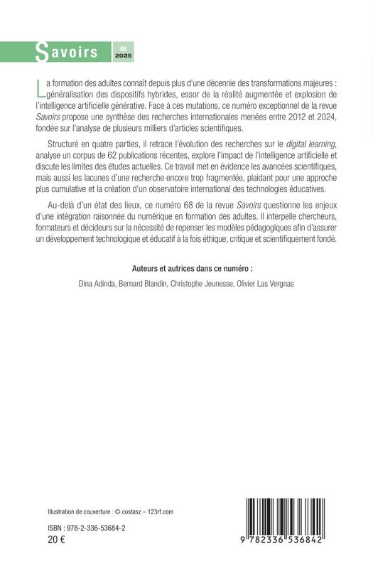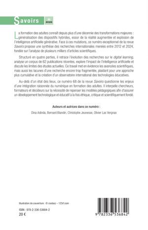 La formation des adultes connaît depuis plus d'une décennie des transformations majeures: généralisation des dispositifs hybrides, essor de la réalité augmentée et explosion de l'intelligence artificielle générative. Face à ces mutations, ce numéro exceptionnel de la revue Savoirs propose une synthèse des recherches internationales menées entre 2012 et 2024, fondée sur l'analyse de plusieurs milliers d'articles scientifiques. Structuré en quatre parties, il retrace l'évolution des recherches sur le digital learning, analyse un corpus de 62 publications récentes, explore l'impact de l'intelligence artificielle et discute les limites des études actuelles. Ce travail met en évidence les avancées scientifiques, mais aussi les lacunes d'une recherche encore trop fragmentée, plaidant pour une approche plus cumulative et la création d'un observatoire international des technologies éducatives. Au-delà d'un état des lieux, ce numéro 68 de la revue Savoirs questionne les enjeux d'une intégration raisonnée du numérique en formation des adultes. Il interpelle chercheurs, formateurs et décideurs sur la nécessité de repenser les modèles pédagogiques afin d'assurer un développement technologique et éducatif à la fois éthique, critique et scientifiquement fondé.