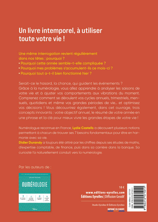 Grâce à la numérologie, vous allez apprendre à analyser les saisons de votre vie et à ajuster vos comportements aux vibrations du moment. Comprenez comment se déroulent vos cycles annuels, trimestriels, mensuels, quotidiens et même vos grandes périodes de vie... et optimisez vos décisions ! Vous découvrirez également, dans cet ouvrage, trois concepts innovants : votre objectif annuel, le résumé de votre année en une phrase et la clé pour mieux vivre les grandes étapes de votre vie !