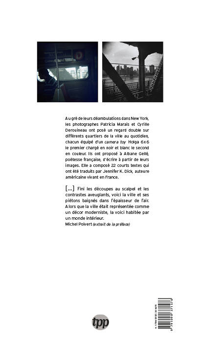 Au gré de leurs déambulations dans New York, les photographes Patricia Marais et Cyrille Derouineau ont posé un regard double sur différents quartiers de la ville au quotidien, chacun équipé d’un camera toy Holga 6âxâ6 le premier chargé en noir et blanc le second en couleur. Au final ils ont sélectionné 50 photographies dont 36 sont assemblées en diptyque nb/couleur, et 14 présentées seules. <br /> Ils ont proposé à Albane Gellé, poétesse française, d’écrire à partir de leurs images. Elle a composé 22 courts textes qui ont été traduits par Jennifer K. Dick, auteure américaine vivant en France.<br /> <br /> [...] Fini les découpes au scalpel et les contrastes aveuglants, voici la ville et ses piétons baignés dans l’épaisseur de l’air. Alors que la ville était représentée comme un décor moderniste, la voici habitée par un monde intérieur.<br /> Michel Poivert (extrait de la préface)