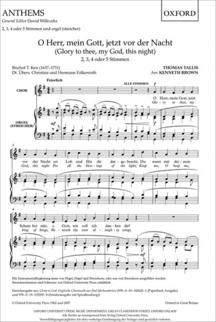 An arrangement of Tallis's Canon for 2, 3, 4, or 5 equal voices, with chamber orchestra or organ and stringsThis German translation of the original English text 'Glory to thee, my God, this night' is also available in the collection, Glory to God. Material for strings is available on hire.